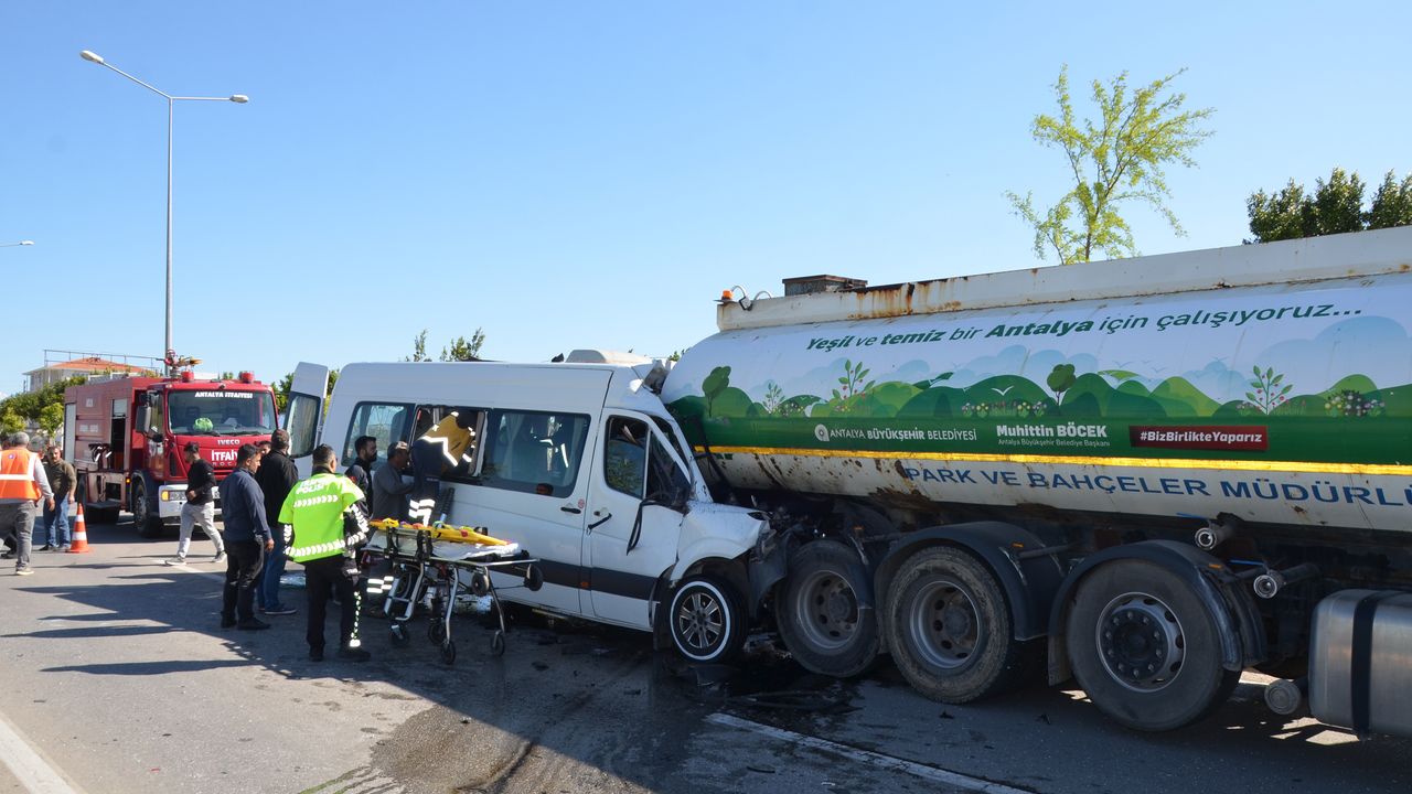 Kaza, saat 10.00 sıralarında, Dikmen Mahallesi'nde Belek Turizm Yolu'nda meydana geldi. Kemer ilçesinden Belek'teki eğlence merkezine giden turistlerin içinde olduğu, Mehmet Deniz’in kullandığı 07 C 1462 plakalı tur minibüsü, refüjde sulama yapan Büyükşehir Belediyesi'ne ait Ramazan Ozan idaresindeki 07 BMR 347 plakalı tankere arkadan çarptı. Şoför Deniz'in araçta sıkıştığı kazada, 1'i çocuk 5 İngiltere uyruklu turist yaralandı.