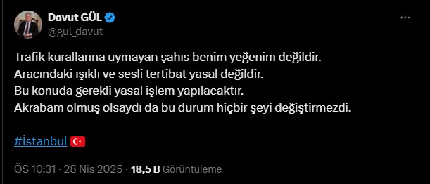 Sosyal medyada paylaşılan bir videoda, çakar tertibatı bulunan lüks aracı kullanan bir kişinin, kendisini kayda alan kişilere "Valinin yeğeniyim" diyerek aracıyla uzaklaştığı anlar yer aldı. Video hakkında sosyal medya hesabından açıklama yapan İstanbul Valisi Davut Gül, bu kişinin akrabası olmadığını ve gerekli yasal işlemin başlatılacağını belirtti. Vali Gül paylaşımında, "Trafik kurallarına uymayan şahıs benim yeğenim değildir. Aracındaki ışıklı ve sesli tertibat yasal değildir. Bu konuda gerekli yasal işlem yapılacaktır. Akrabam olmuş olsaydı da bu durum hiçbir şeyi değiştirmezdi" ifadelerini kullandı.