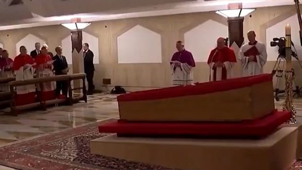 Vatikan Basın Ofisi, törenin düzenleneceği odanın ilk görüntülerini paylaştı. Görüntülerde, Kardinal Camerlengo Kevin Joseph Farrell, Tören Yöneticisi Başpiskopos Diego Giovanni Ravelli ve Tören Yöneticisi Lubomir Welnitz'in Papa Franciscus'un bedenine kutsal su serpme törenini gerçekleştirdiği görülüyor.